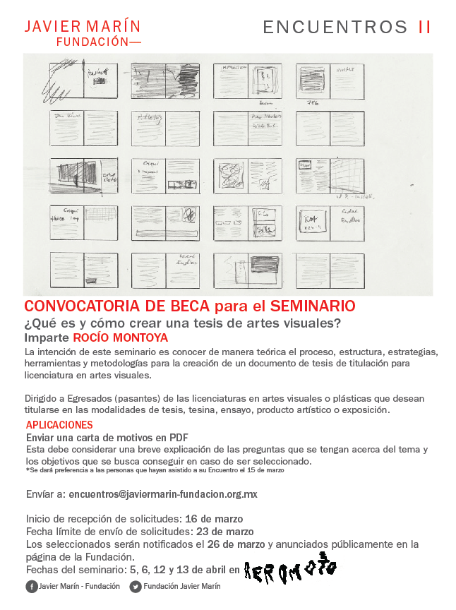La Fundación Javier Marín invita al seminario impartido por Rocío Montoya: ¿Qué es y cómo crear una tesis de artes visuales? Se otorgarán 8 becas, por lo que invitamos a los alumnos de posgrado a participar.