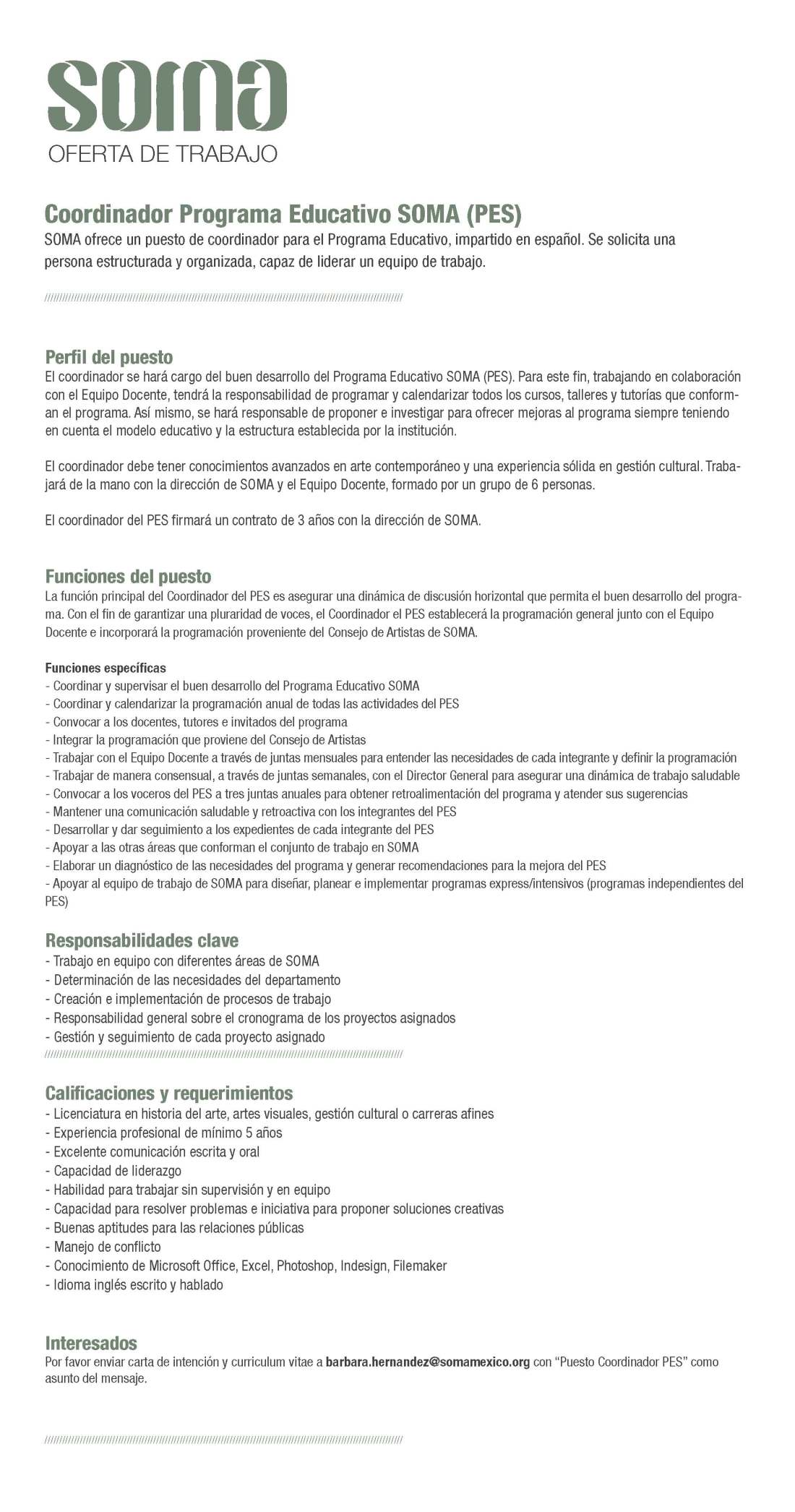 Exalumnos del Departamento de Arte y colaboradores de SOMA, ofertan plaza como Coordinador de Programa Educativo SOMA.