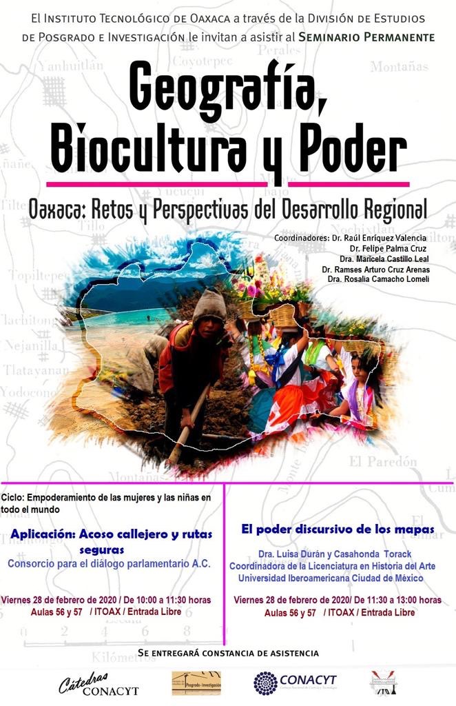 Dicha conferencia es en el marco del seminario permanente Geografía, Biocultura y Poder. Oaxaca: retos y perspectivas del desarrollo regional.