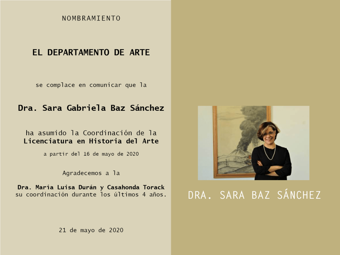 Felicitamos a la Dra. Sara Gabriela Baz por su nuevo cargo como Coordinadora en la Licenciatura en Historia del Arte.