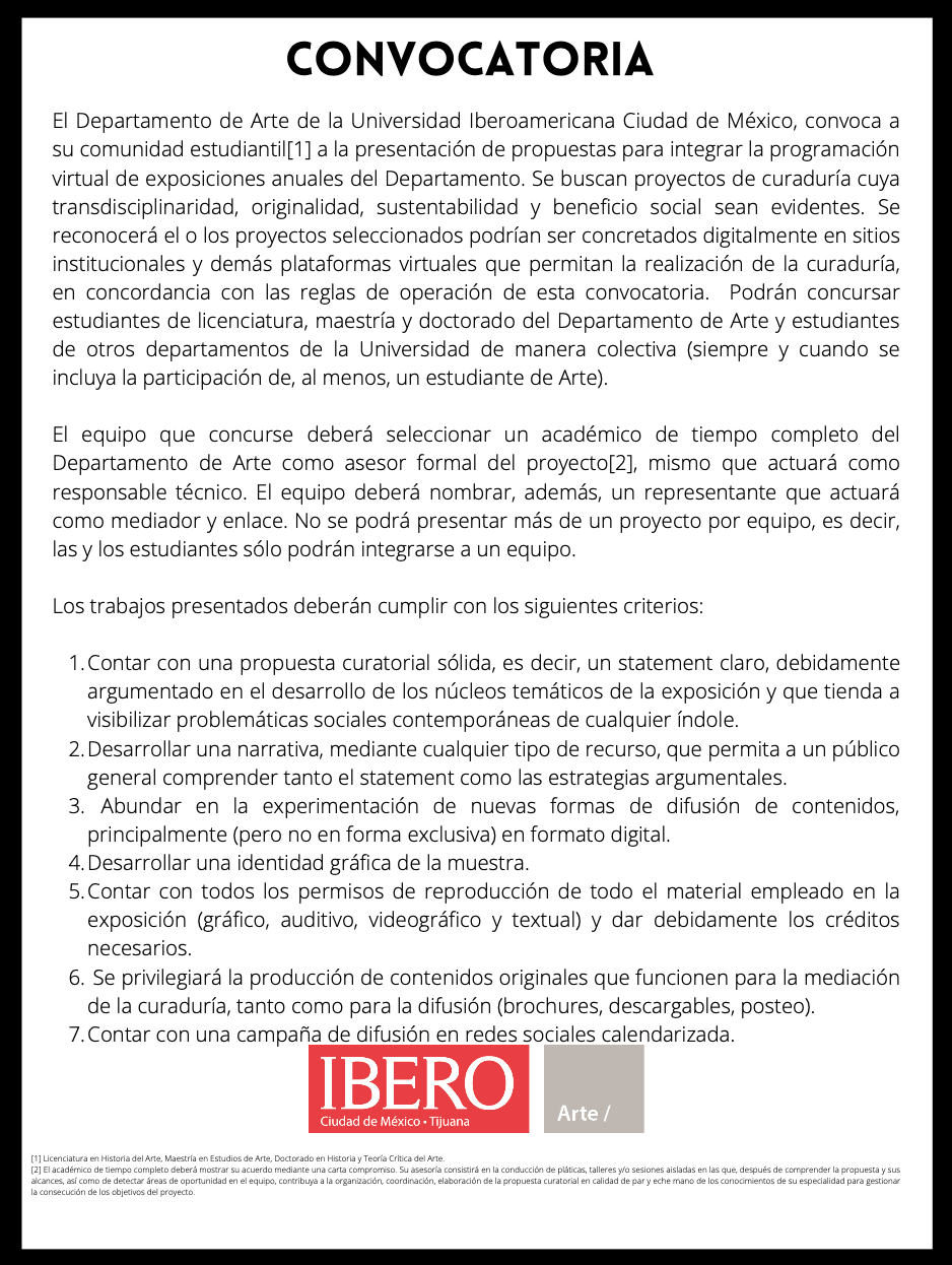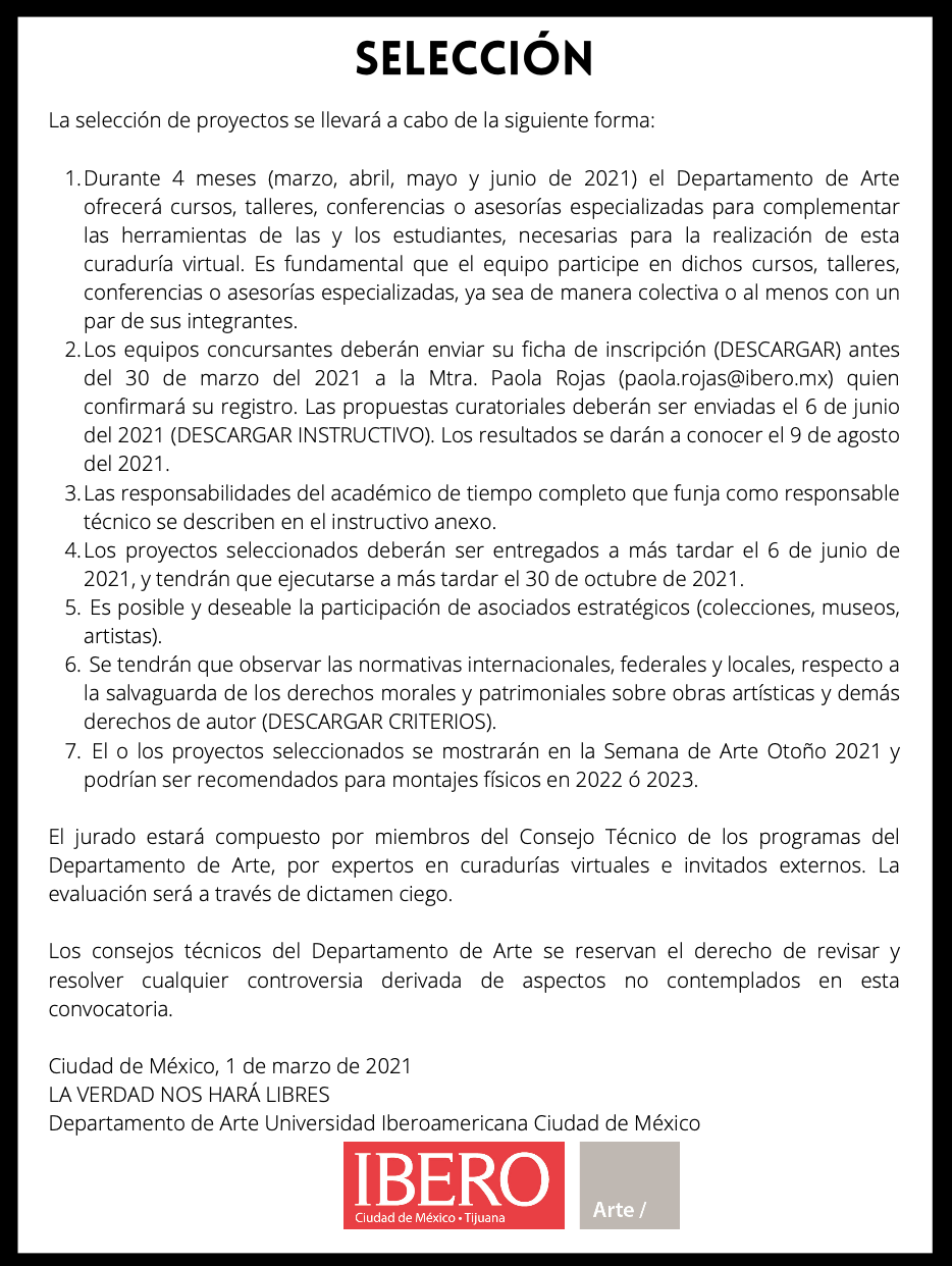 La curaduría seleccionada formará parte del programa expositivo del Departamento de Arte.