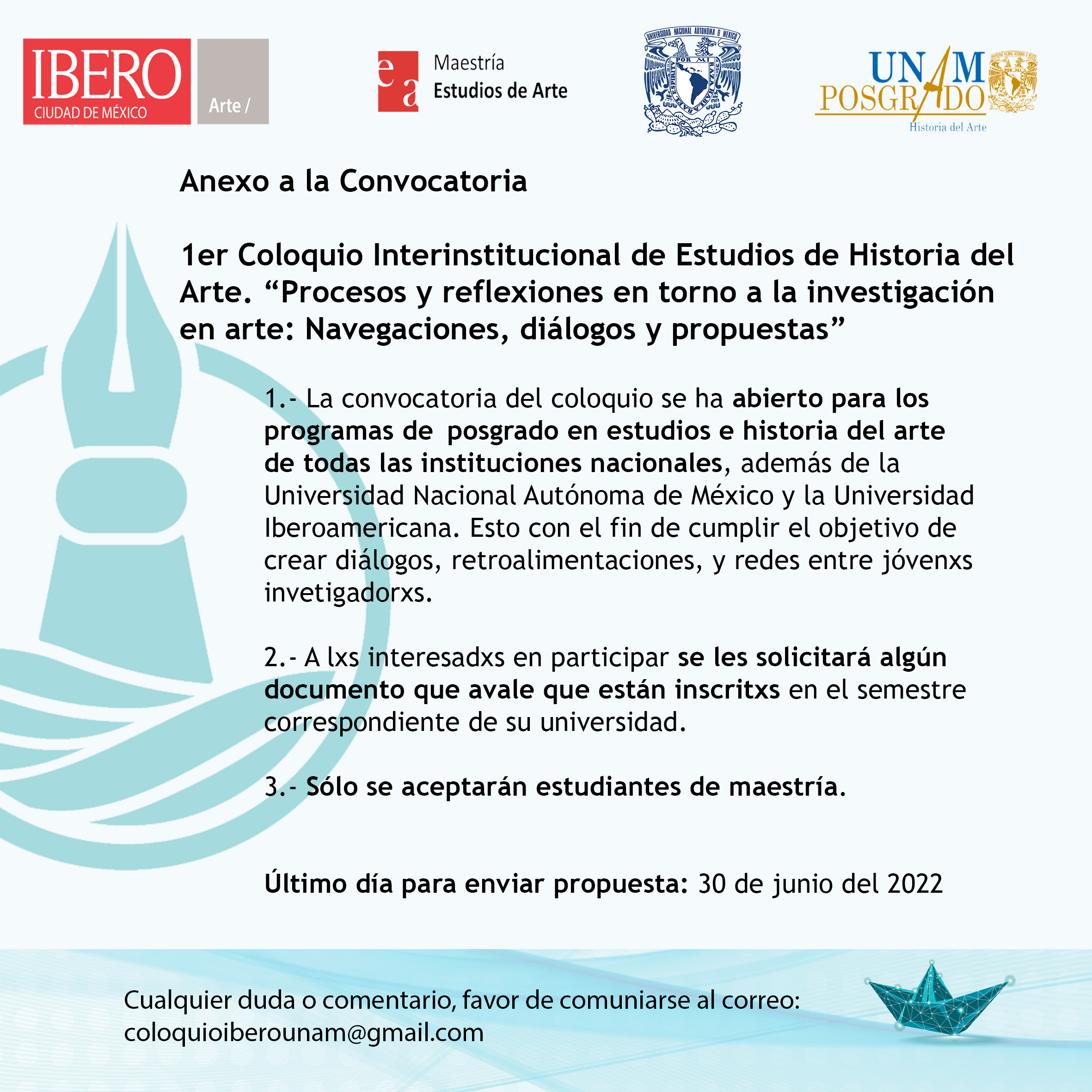 Les invitamos a participar en el 1er Coloquio Interinstitucional de Estudios e Historia del Arte(Posgrado en Historia del Arte, UNAM / Maestría en Estudios de Arte, Universidad Iberoamericana) con el tema es: “Procesos y reflexiones en torno a la investigación en arte: navegaciones, diálogos y propuestas.” Cierre de inscripción: 30 de junio del 2022.