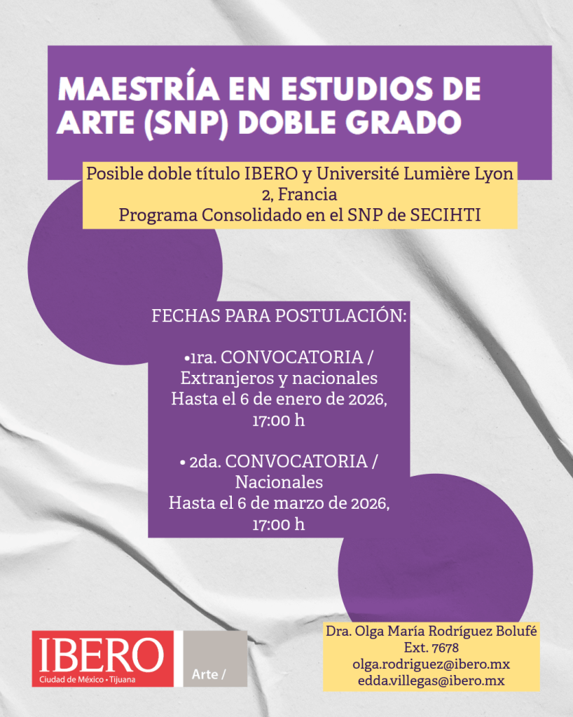 By: Arte Ibero noviembre 14, 2025noviembre 14, 2025 Convocatorias, NoticiasDepartamento de Arte, Ibero, Maestría en Estudios de Arte Maestría en Estudios de Arte MAESTRÍA EN ESTUDIOS DE ARTE Convocatoria 2026 Convocatoria 2026 MEADescarga Comparte esto: Haz clic para compartir en X (Se abre en una ventana nueva) X Haz clic para compartir en Facebook (Se abre en una ventana nueva) Facebook Haz clic para compartir en Telegram (Se abre en una ventana nueva) Telegram Haz clic para enviar un enlace por correo electrónico a un amigo (Se abre en una ventana nueva) Correo electrónico Haz clic para compartir en WhatsApp (Se abre en una ventana nueva) WhatsApp Relacionado