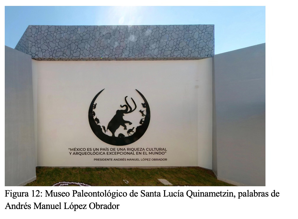Si bien, estas dos propuestas museográficas se diferencian por una temporalidad de veintiún años, se distinguen aún más por el discurso que las sustenta, las instituciones relacionadas con su fundación y su presupuesto. Considero un poco triste que el proyecto de Santa Lucía haya tenido una planeación delicada, un diseño extraordinario y una mediación envidiable cuando se encuentra realmente aislado de las personas que pueden visitarlo. Los visitantes del aeropuerto tendrían que desviarse completamente de su ruta para hacer la visita y las personas de la localidad de Santa María Ajoloapan, Real Granada o San Jerónimo Xonoachahuacan se encuentran un tanto lejos y necesitan de transporte público o privado para acercarse. Es natural que cada administración gubernamental quiera lucirse con sus construcciones, sus descubrimientos y su “progreso” pero puede ser un poco más útil a nivel social reubicar los centros culturales como Museo Paleontológico de Santa Lucía Quinametzin en sitios donde puedan tener un alto impacto sobre la población y no sobre un discurso gubernamental. En el caso del Museo del Mamut, hay una utilidad para la Cuarta Transformación que se transparenta en la narrativa, la localización y el diseño del lugar que imita al aeropuerto y que no deja de mencionar a AMLO como presidente en todas las paredes, ver figura 12.