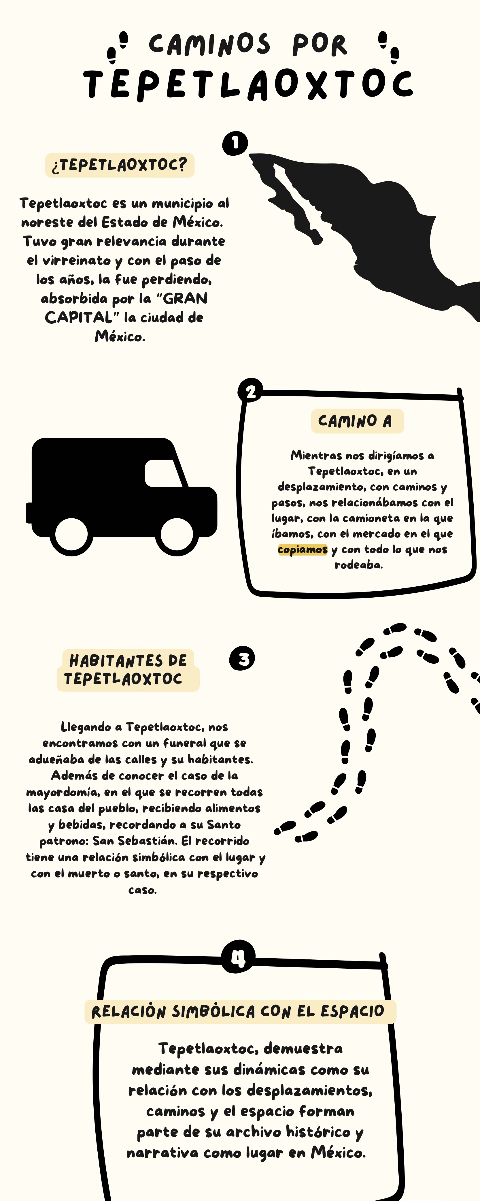 Entonces, para detallar mis conocimientos sobre el desplazamiento y recorridos de Tepetlaoxtoc, considero necesario comenzar desde mi lugar de enunciamiento. Yo, nací en la Ciudad de México y he vivido aquí por 19 años, lo que llamó: toda mi vida y a lo largo de esta, la Ciudad se ha vuelto mi forma de conocer, aprender, expresar e incluso de caminar y desplazarme. El ejemplo claro y que siempre me ha determinado podría ser mi conocimiento sobre el tráfico, el cual día con día se me hace más común o mi familiaridad con los cambios en lugares de vivienda, considero parte de mi rutina y caminos ver una construcción mínima en el día y lo llamaría poco. ¿Y Tepetlaoxtoc? ¿Esto se vive en Tepetlaoxtoc?