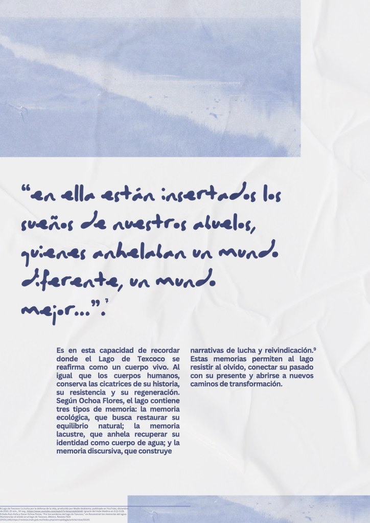 -El agua tiene memoria- Escuche alguna vez en clase. Mientras cruzaba lo que un día fue lago podía escuchar el movimiento del agua. Sí, el agua tiene memoria y se aferra a lo que fue suyo. Así mismo, las personas. El siguiente texto tiene como objetivo abordar la problemática de los texcocanos ante la desecación del lago.