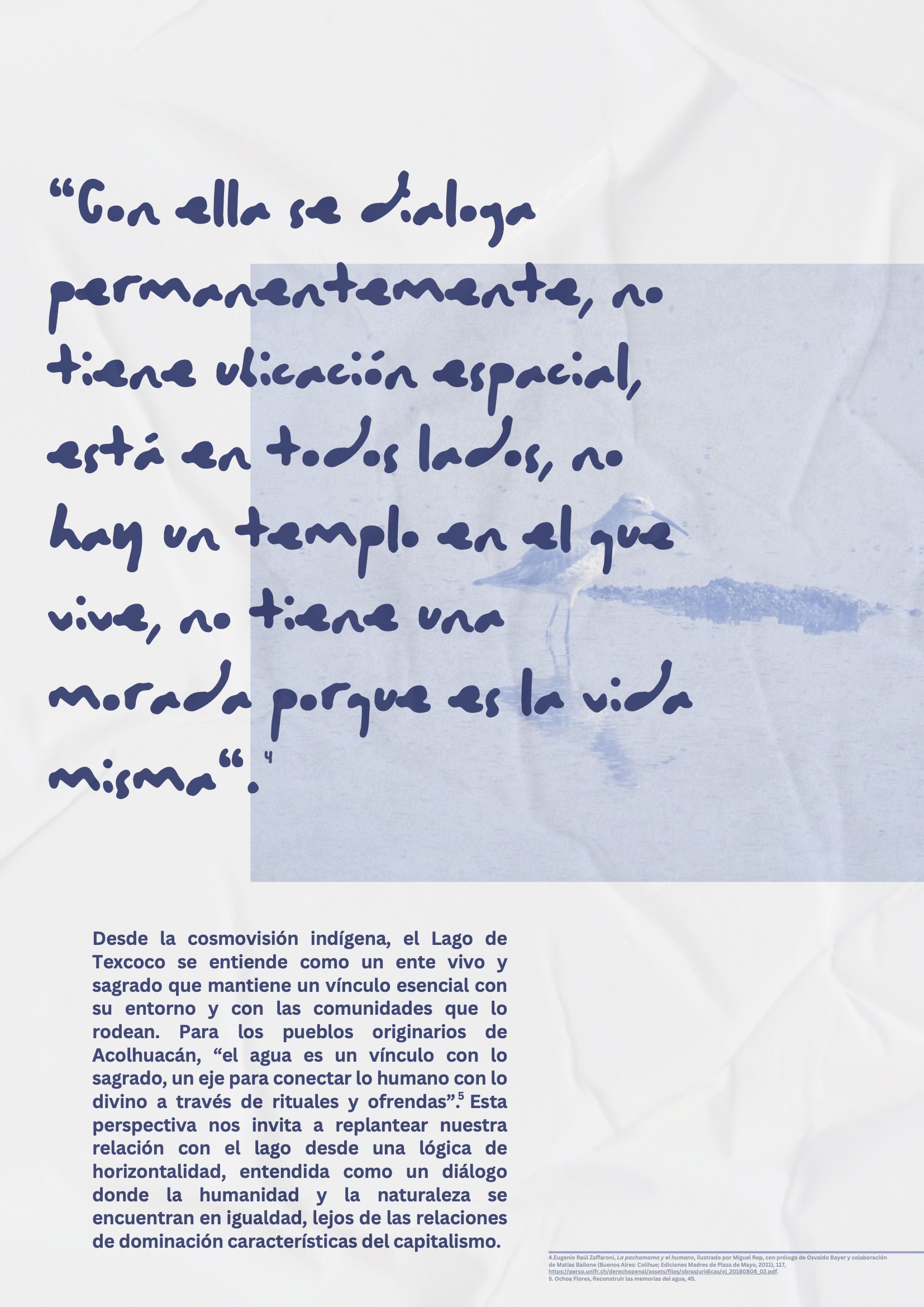 Quien fuera capaz de poseer el lago, tendría a su alcance la historia y los recuerdos de toda una cultura. Evitar que el agua emerja sería negarle a todo un pueblo su identidad. El agua es más que un recurso, es por sí mismo, un ser vivo con el cuál quienes lo habitan mantienen una relación, una conexión auténtica. No obstante, los habitantes de Texcoco tienen cualidad de agua, sin importar los constantes esfuerzos por conseguir el desplazamiento, esta sigue firme reclamando su espacio.
