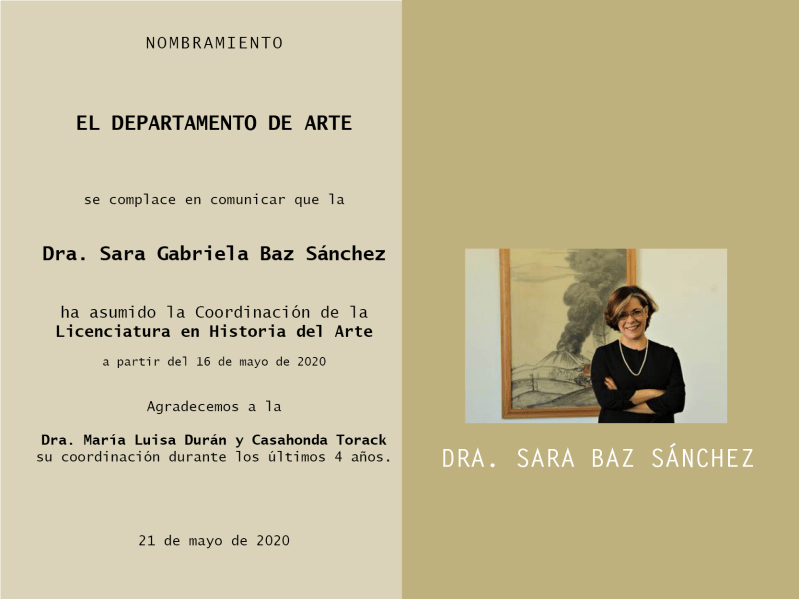 Felicitamos a la Dra. Sara Gabriela Baz por su nuevo cargo como Coordinadora en la Licenciatura en Historia del Arte. La Dra. Baz asumió el cargo el pasado 16 de mayo de 2020. Agradecemos a la Dra. Luisa Durán por su coordinación durante los últimos cuatro años.
