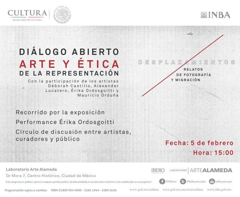 Con motivo del cierre de la exposición Desplazamientos Relatos de fotografía y migración, recorrido de la exposición, performance de Érika Ordosgoitti y círculo de discusión. Este 5 de febrero a las 15 hrs. Selecciona la imagen para ver los detalles del evento.